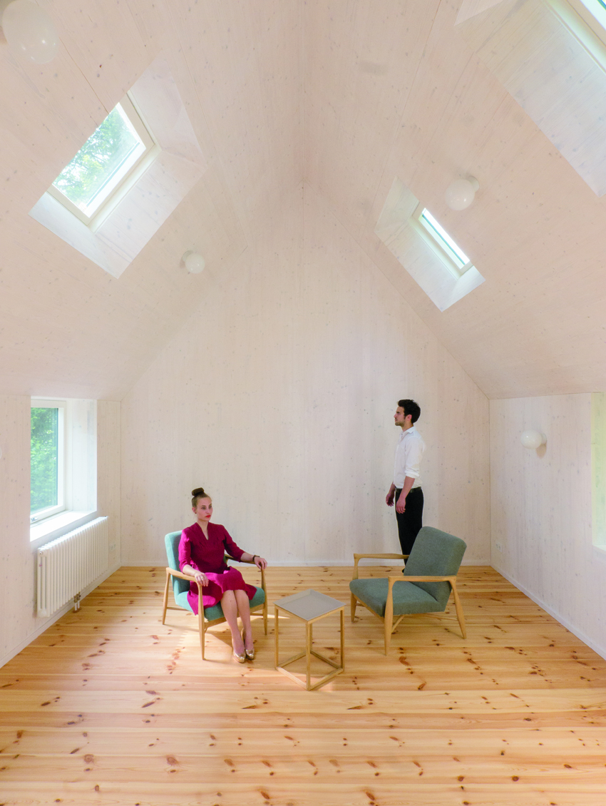 Die unabhängige, leichte Zusatzkonstruktion erfordert keine Veränderungen am Massivbau des Bestands: Der Massivholzbau mit Zinkblechbekleidung auf einer eingespannten Stahlkonstruktion steht für sich. Die Erschließung erfolgt über den bestehenden Treppenraum des Wohnhauses.